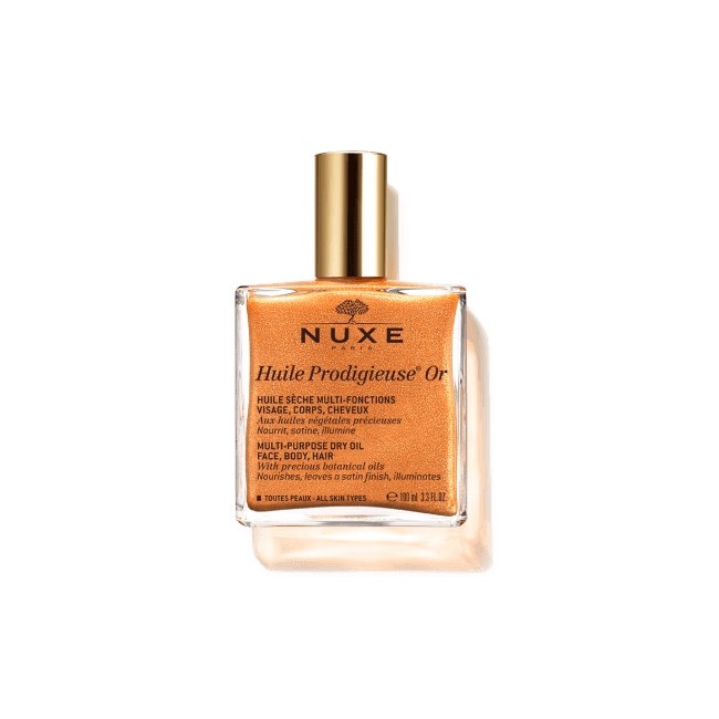 Nuxe Huile Prodigieuse Or è un olio secco multifunzione ideale per la pelle secca; può essere utilizzato su viso, corpo e capelli. Questo prodotto contiene un'elevata percentuale di ingredienti naturali, è vegano ed apporta i seguenti benefici: