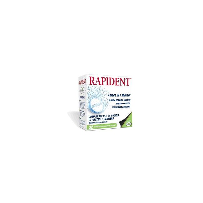 Diapositivo medico CE in compresse utile per pulire protesi e dentiere in 1 minuto, eliminando residui e macchie e rimuovendo i batteri. La speciale formulazione a base di salvia, bicarbonato e mela verde igienizza la dentiera in profondità prevenendo la formazione di placca e tartaro ed eliminando anche le macchie più tenaci (come nicotina, caffè e tè). Grazie agli estratti di menta, Rapident Compresse agisce anche sull'alito, donando una piacevole sensazione di freschezza.È a base di estratti naturali .