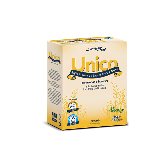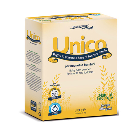 Unico bagno polvere è una composizione a base di amido di riso micronizzato, avena colloidale, lecitina di soia.