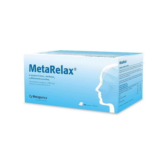 Metagenics Metarelax 84 bustine è un integratore a base di Magnesio, Vitamine del gruppo B, Folato, Vitamina D e taurina utile in caso di stress, stanchezza, affaticamento, cattivo umore e crampi muscolari.