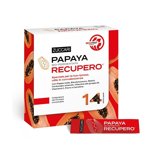 Integratore alimentare a base di polpa di Carica papaya biofermentata, atomizzata e granulata con naturali proprietà antiossidanti. Papaya Recupero è ideale nei periodi di debolezza, spossatezza e quindi utile anche nei periodi di convalescenza. La papaya bio-fermentata zuccari è resa speciale da Recufast Complex, un mix di attivi per un pronto e pieno recupero: eleuterococco tonico-adattogeno, cordyceps sinensis per l'azione tonica e di sostegno metabolico, ferro e vitamine del gruppo B per ridurre stanchezza e affaticamento oltre a vitamina C che contribuisce al normale metabolismo energetico e accresce l'assorbimento del ferro. L'esclusivo mix è reso completo da pappa reale, reishi e carnitina.