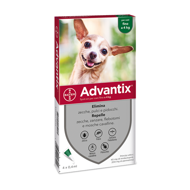 Principi attiviOgni pipetta da 0,4 ml contiene Imidacloprid: 40,0 mg. Permetrina (40/60): 200,0 mg. Eccipiente(i). Butilidrossitoluene (E321): 0,4 mg.... Leggi di piùDettagli ADVANTIX SPOT ON*4PIP 0-4KG