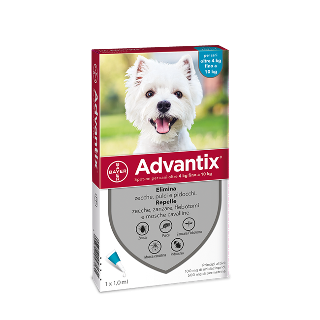 Principi attiviOgni pipetta da 1.0 ml contiene Imidacloprid: 100.0 mg. Permetrina: (40/60) 500 mg. Eccipiente(i). Butilidrossitoluene (E321): 1,0 mg.... Leggi di piùDettagli ADVANTIX SPOT ON*1PIP 4-10KG