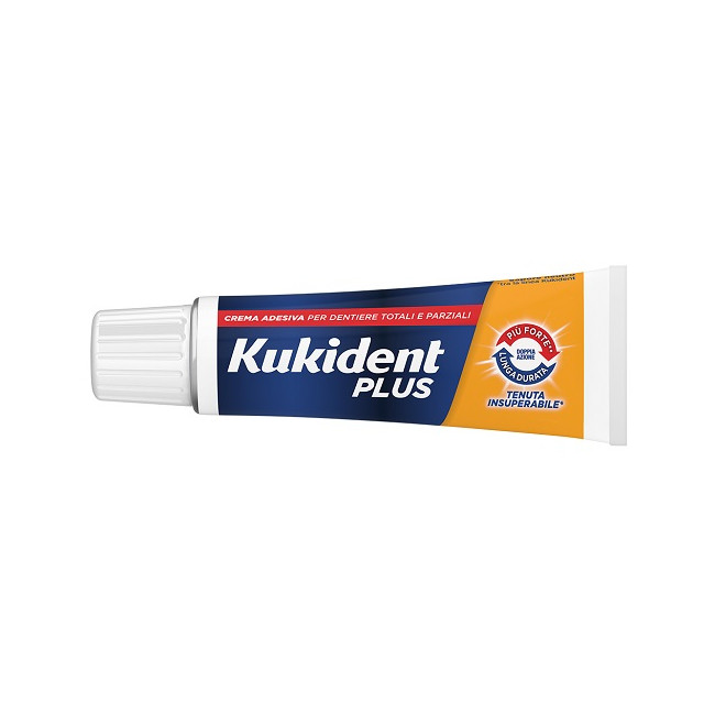 Kukident Plus Doppia Azione è una crema adesiva per dentiere totali e parziali, progettata per garantire una tenuta forte e duratura per tutta la giornata.