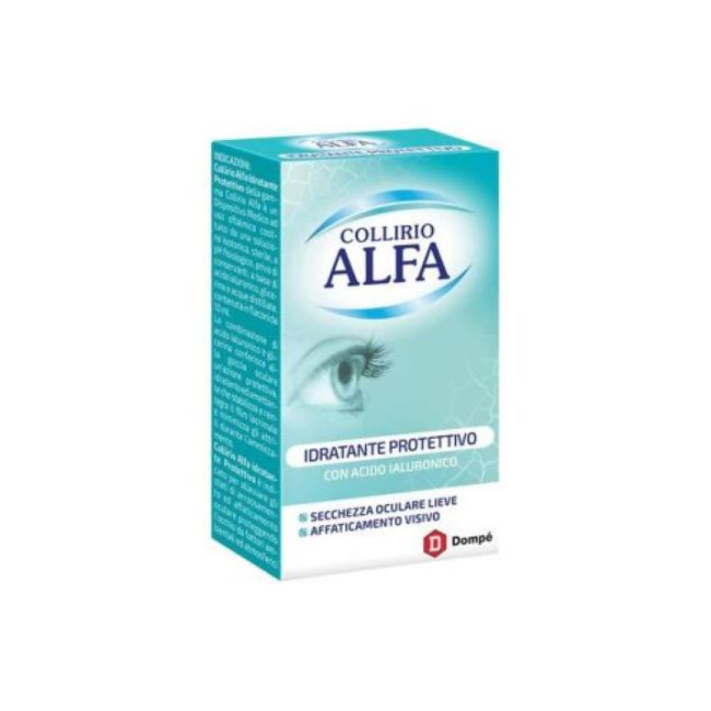 Dompè Collirio Alfa Idratante Protettivo è un dispositivo medico oftalmico, in flacone multidose da 10 Ml, ideato per alleviare arrossamento e affaticamento oculare. Questo prodotto è efficace per proteggere l'occhio da fattori ambientali potenzialmente aggressivi e irritanti quali inquinamento, smog, clima secco e stress visivi, ma anche raccomandato per chi utilizza dispositivi elettronici per lunghi periodi o è esposto a condizioni ambientali sfavorevoli. Grazie alla sua formulazione a base di una soluzione isotonica sterile a pH neutro con acido ialuronico, il collirio alfa idratante e protettivo dona una duratura lubrificazione ed idratazione anche a chi soffre di occhio secco e scarsa lacrimazione, donando sollievo agli occhi e benessere quotidiano.
