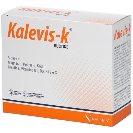 KALEVIS-K® bustine è un complemento alimentare a base di Magnesio, Potassio, Sodio, Creatina, Vitamine B1, B6, B12 e C, indicato nei casi di ridotto apporto con la dieta o di aumentato fabbisogno di tali elementi. La Vitamina C e la Vitamina B1 contribuiscono al normale metabolismo energetico. La Vitamina B12 e la Vitamina B6 sono utili alla riduzione della stanchezza e dell’affaticamento. Il Magnesio favorisce l’equilibrio elettrolitico. Il Potassio contribuisce alla normale funzione muscolare e al mantenimento di una normale pressione sanguigna.