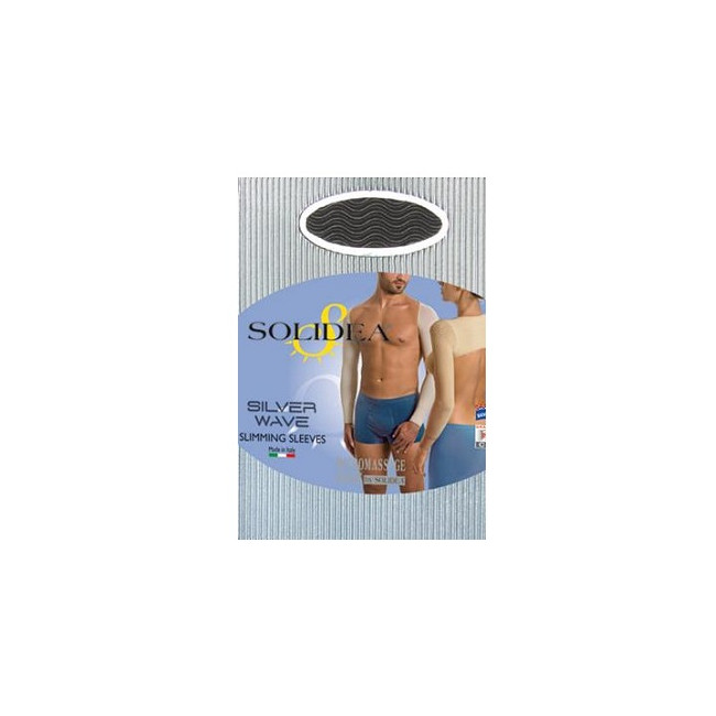 Maniche micromassaggianti lunghe fino al polso, senza cuciture, indicate per contrastare l’aspetto a buccia d’arancia sulle braccia, con innovativo supporto dorsale che le sostiene avvolgendo le spalle per una perfetta vestibilità. Il tessuto micromassaggiante con i naturali movimenti degli arti superiori stimola la microcircolazione per una efficace azione anti-cellulite. Inoltre la compressione graduata decrescente 15/21 mmHg dal polso alla spalla aiuta il ritorno venoso e il drenaggio linfatico, pertanto é indicato anche nei linfedemi agli arti superiori post-traumatici e iatrogeni (mastectomia). Realizzato in filato batteriostatico agli ioni d’argento, garantisce il mantenimento dell’equilibrio biologico della pelle e la sua naturale traspirazione, conservando la pelle sana e difesa da cattivi odori.Colore: nero.